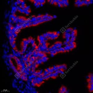 IF检测Hsp90蛋白(货号 GB12284)(红色). 样品: 大鼠卵巢, 4%多聚甲醛 (货号G1101) 固定12-24小时. 抗原修复: 柠檬酸抗原修复液(干粉, pH 6.0) (G1201), 高压锅均匀喷气计时2分钟. 封闭: 3% BSA(货号GC305010)的PBS溶液, 室温孵育30分钟. —抗: 1: 500稀释, 4℃ 孵育过夜. 二抗: Cy3标记山羊抗小鼠IgG (H+L) (货号GB21301), 1: 300稀释, 室温孵育1小时. |
