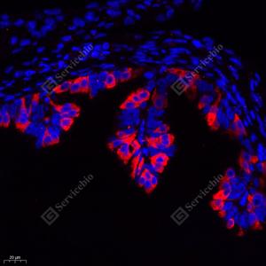 IF检测Hsp90蛋白(货号 GB12284)(红色). 样品: 小鼠睾丸, 4%多聚甲醛 (货号G1101) 固定12-24小时. 抗原修复: 柠檬酸抗原修复液(干粉, pH 6.0) (G1201), 高压锅均匀喷气计时2分钟. 封闭: 3% BSA(货号GC305010)的PBS溶液, 室温孵育30分钟. —抗: 1: 500稀释, 4℃ 孵育过夜. 二抗: Cy3标记山羊抗小鼠IgG (H+L) (货号GB21301), 1: 300稀释, 室温孵育1小时. |