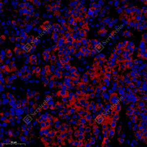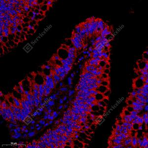 IF检测SLC41A2蛋白(货号 GB114524)(红色). 样品: 人结肠癌, 4%多聚甲醛 (货号G1101) 固定12-24小时. 抗原修复: Tris-EDTA抗原修复液(pH 9.0) (G1203), 98℃, 20分钟. 封闭: 3% BSA(货号GC305010)的PBS溶液, 室温孵育30分钟. —抗: 1: 1000稀释, 4℃ 孵育过夜. 二抗: Cy3标记山羊抗兔IgG (H+L) (货号GB21303), 1: 300稀释, 室温孵育1小时. |