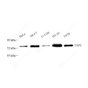 WB检测TAP2蛋白(货号 GB113273). 样品: 经RIPA裂解液(货号G2002)处理的蛋白质. 封闭: 封闭: 3%脱脂牛奶(货号GC310001)溶于TBST溶液, 室温孵育1小时. —抗: 1: 600稀释, 4℃ 孵育过夜. 二抗: HRP标记山羊抗兔IgG (H+L) (货号GB23303), 1: 5000稀释, 室温孵育1小时. |