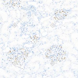 | IHC检测Wilms Tumor Protein蛋白(货号 GB150202). 样品: 人肾, 4%多聚甲醛 (货号G1101) 固定12-24小时. 抗原修复: 抗原修复仪(货号 ARI-4),Tris-EDTA抗原修复液(pH 9.0) (货号G1203), 水浴100℃, 25分钟, 随后用20 μg/mL的蛋白酶处理5分钟. —抗: 1: 1000稀释, 4℃ 孵育过夜. 二抗: S-vision免疫组化多聚二抗(山羊抗小鼠), 即用型(货号G1301), 室温孵育20分钟. |
