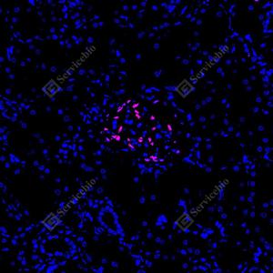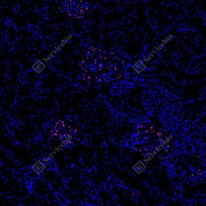 | IF检测Wilms Tumor Protein蛋白(货号 GB150202)(红色). 样品: 人肾, 4%多聚甲醛 (货号G1101) 固定12-24小时. 抗原修复: 抗原修复仪(货号 ARI-4),Tris-EDTA抗原修复液(pH 9.0) (货号G1203), 水浴100℃, 25分钟, 随后用20 μg/mL的蛋白酶处理5分钟. 封闭: 3% BSA(货号GC305010)的PBS溶液, 室温孵育30分钟. —抗: 1: 1000稀释, 4℃ 孵育过夜. 二抗: Cy3标记山羊抗小鼠IgG (H+L) (货号GB21301), 1: 300稀释, 室温孵育1小时. |