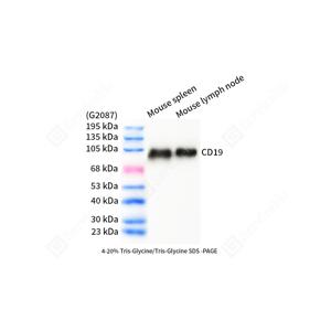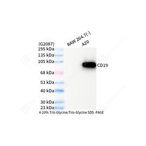 | WB检测CD19蛋白(货号 GB150200). 样品: 经RIPA裂解液(货号G2002)处理的蛋白质. 封闭: 3%脱脂牛奶(货号GC310001)溶于TBST溶液, 室温孵育1小时. —抗: 1: 500稀释, 4℃ 孵育过夜. 二抗: HRP标记山羊抗兔IgG (H+L) (货号GB23303), 1: 5000稀释, 室温孵育1小时. |