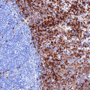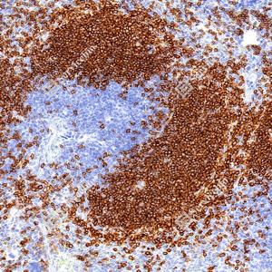 | IHC检测CD19蛋白(货号 GB150200). 样品: 小鼠淋巴结, 4%多聚甲醛 (货号G1101) 固定12-24小时. 抗原修复: 抗原修复仪(货号 ARI-4),Tris-EDTA抗原修复液(pH 9.0) (货号G1203), 水浴100℃, 25分钟. —抗: 1: 800稀释, 4℃ 孵育过夜. 二抗: S-vision免疫组化多聚二抗(山羊抗兔),即用型 (货号G1302), 室温孵育20分钟. |