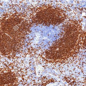 | IHC检测CD19蛋白(货号 GB150200). 样品: 小鼠脾, 4%多聚甲醛 (货号G1101) 固定12-24小时. 抗原修复: 抗原修复仪(货号 ARI-4),Tris-EDTA抗原修复液(pH 9.0) (货号G1203), 水浴100℃, 25分钟. —抗: 1: 800稀释, 4℃ 孵育过夜. 二抗: S-vision免疫组化多聚二抗(山羊抗兔),即用型 (货号G1302), 室温孵育20分钟. |