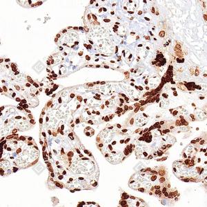 | IHC检测Histone H1. 5蛋白(货号 GB150208). 样品: 人胎盘, 4%多聚甲醛 (货号G1101) 固定12-24小时. 抗原修复: 抗原修复仪(货号 ARI-4),柠檬酸抗原修复液(干粉, pH 6.0) (G1201), 高压锅均匀喷气计时2分钟. —抗: 1: 1000稀释, 4℃ 孵育过夜. 二抗: S-vision免疫组化多聚二抗(山羊抗小鼠), 即用型(货号G1301), 室温孵育20分钟. |