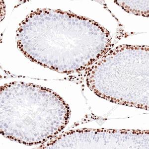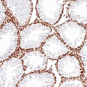 | IHC检测Histone H1. 5蛋白(货号 GB150208). 样品: 小鼠睾丸, 4%多聚甲醛 (货号G1101) 固定12-24小时. 抗原修复: 抗原修复仪(货号 ARI-4),柠檬酸抗原修复液(干粉, pH 6.0) (G1201), 高压锅均匀喷气计时2分钟. —抗: 1: 1000稀释, 4℃ 孵育过夜. 二抗: S-vision免疫组化多聚二抗(山羊抗小鼠), 即用型(货号G1301), 室温孵育20分钟. |