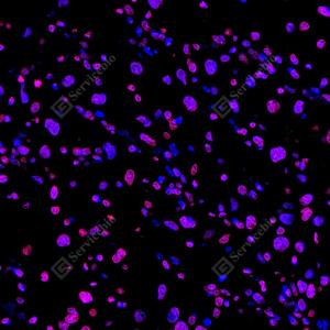 | IF检测Histone H1. 5蛋白(货号 GB150208)(红色). 样品: 小鼠脑, 4%多聚甲醛 (货号G1101) 固定12-24小时. 抗原修复: 抗原修复仪(货号 ARI-4),柠檬酸抗原修复液(干粉, pH 6.0) (G1201), 高压锅均匀喷气计时2分钟. 封闭: 3% BSA(货号GC305010)的PBS溶液, 室温孵育30分钟. —抗: 1: 1000稀释, 4℃ 孵育过夜. 二抗: Cy3标记山羊抗小鼠IgG (H+L) (货号GB21301), 1: 300稀释, 室温孵育1小时. |