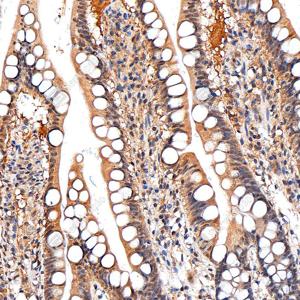 | IHC检测STAT3蛋白(货号 GB15176). 样品: 人结肠, 4%多聚甲醛 (货号G1101) 固定12-24小时. 抗原修复: 抗原修复仪(货号 ARI-4),Tris-EDTA抗原修复液(pH 9.0) (货号G1203), 水浴100℃, 25分钟. —抗: 1: 500稀释, 4℃ 孵育过夜. 二抗: S-vision免疫组化多聚二抗(山羊抗小鼠), 即用型(货号G1301), 室温孵育20分钟. |