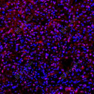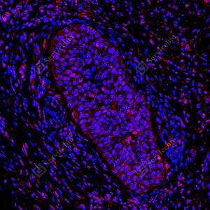 | IF检测STAT3蛋白(货号 GB15176)(红色). 样品: 人宫颈癌, 4%多聚甲醛 (货号G1101) 固定12-24小时. 抗原修复: 抗原修复仪(货号 ARI-4),Tris-EDTA抗原修复液(pH 9.0) (货号G1203), 水浴100℃, 25分钟. 封闭: 3% BSA(货号GC305010)的PBS溶液, 室温孵育30分钟. —抗: 1: 500稀释, 4℃ 孵育过夜. 二抗: Cy3标记山羊抗小鼠IgG (H+L) (货号GB21301), 1: 300稀释, 室温孵育1小时. |