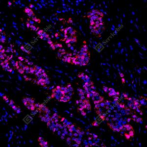 | IF检测STAT3蛋白(货号 GB15176)(红色). 样品: 人乳腺癌, 4%多聚甲醛 (货号G1101) 固定12-24小时. 抗原修复: 抗原修复仪(货号 ARI-4),Tris-EDTA抗原修复液(pH 9.0) (货号G1203), 水浴100℃, 25分钟. 封闭: 3% BSA(货号GC305010)的PBS溶液, 室温孵育30分钟. —抗: 1: 500稀释, 4℃ 孵育过夜. 二抗: Cy3标记山羊抗小鼠IgG (H+L) (货号GB21301), 1: 300稀释, 室温孵育1小时. |