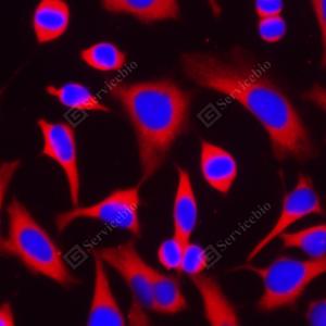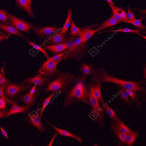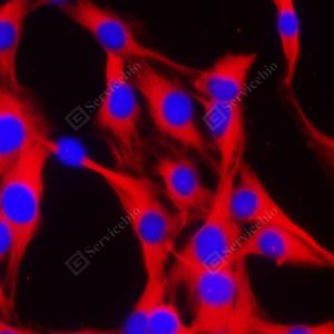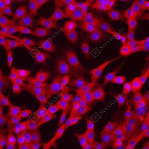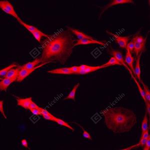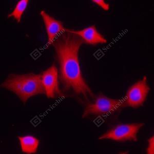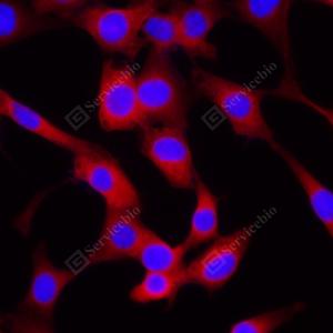 ICC检测beta Tubulin蛋白(货号 GB152667)(红色). 样品: NH3T3细胞, 在预冷的甲醇中固定 10 分钟. 封闭: 3% BSA(货号GC305010)的PBS溶液, 室温孵育30分钟. —抗: 1: 300稀释, 4℃ 孵育过夜. 二抗: Cy3标记山羊抗兔IgG (H+L) (货号GB21303), 1: 300稀释, 室温孵育1小时. |