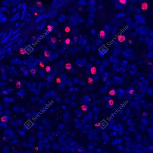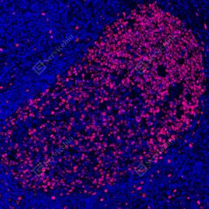 IF检测Ki67蛋白(货号 GB151141)(红色). 样品: 人扁桃体, 4%多聚甲醛 (货号G1101) 固定12-24小时. 抗原修复: 柠檬酸抗原修复液(干粉, pH 6.0) (G1201), 高压锅均匀喷气计时2分钟. 封闭: 3% BSA(货号GC305010)的PBS溶液, 室温孵育30分钟. —抗: 1: 500稀释, 4℃ 孵育过夜. 二抗: Cy3标记山羊抗小鼠IgG (H+L) (货号GB21301), 1: 300稀释, 室温孵育1小时. |