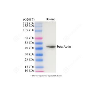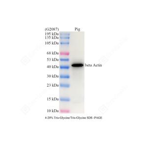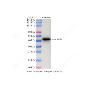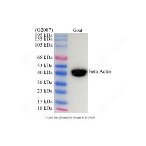WB检测beta Actin蛋白(货号 GB15001). 样品: 经RIPA裂解液(货号G2002)处理的蛋白质. 封闭: 3%脱脂牛奶(货号GC310001)溶于TBST溶液, 室温孵育1小时. —抗: 1: 5000稀释, 4℃ 孵育过夜. 二抗: HRP标记山羊抗小鼠IgG (H+L) (货号GB23301), 1: 5000稀释, 室温孵育1小时. |