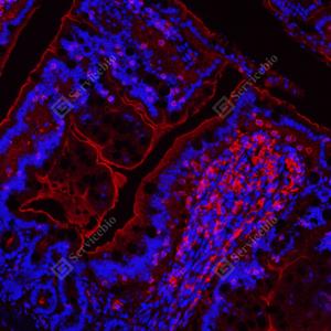 IF检测beta Actin蛋白(货号 GB15001)(红色). 样品: 大鼠小肠, 4%多聚甲醛 (货号G1101) 固定12-24小时. 抗原修复: 柠檬酸抗原修复液(干粉, pH 6.0) (G1201), 高压锅均匀喷气计时2分钟. 封闭: 3% BSA(货号GC305010)的PBS溶液, 室温孵育30分钟. —抗: 1: 1000稀释, 4℃ 孵育过夜. 二抗: Cy3标记山羊抗小鼠IgG (H+L) (货号GB21301), 1: 300稀释, 室温孵育1小时. |