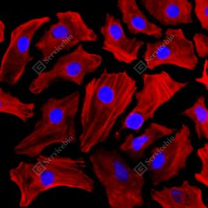 ICC检测beta Actin蛋白(货号 GB15001)(红色). 样品: HeLa细胞, 4%多聚甲醛 (货号G1101) 固定20分钟. 封闭: 3% BSA(货号GC305010)的PBS溶液, 室温孵育30分钟. 一抗: 1: 300稀释, 4℃ 孵育过夜. 二抗: Cy3标记山羊抗小鼠IgG (H+L) (货号GB21301), 1: 300稀释, 室温孵育1小时. |