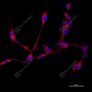 ICC检测beta Actin蛋白(货号 GB15001)(红色). 样品: NIH3T3细胞, 4%多聚甲醛 (货号G1101) 固定20分钟. 封闭: 3% BSA(货号GC305010)的PBS溶液, 室温孵育30分钟. 一抗: 1: 300稀释, 4℃ 孵育过夜. 二抗: Cy3标记山羊抗小鼠IgG (H+L) (货号GB21301), 1: 300稀释, 室温孵育1小时. |