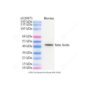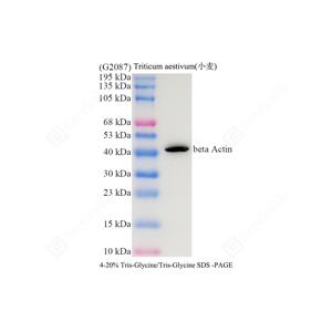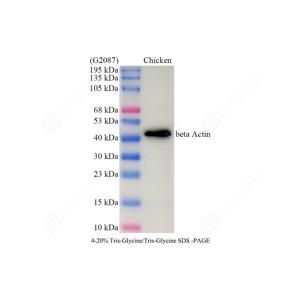 | WB检测beta Actin蛋白(货号 GB15003). 样品: 经RIPA裂解液(货号G2002)处理的蛋白质. 封闭: 3%脱脂牛奶(货号GC310001)溶于TBST溶液, 室温孵育1小时. —抗: 1: 3000稀释, 4℃ 孵育过夜. 二抗: HRP标记山羊抗兔IgG (H+L) (货号GB23303), 1: 5000稀释, 室温孵育1小时. |