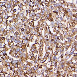 | IHC检测beta Actin蛋白(货号 GB15003). 样品: 人肺癌, 4%多聚甲醛 (货号G1101) 固定12-24小时. 抗原修复: 柠檬酸抗原修复液(干粉, pH 6.0) (G1201), 高压锅均匀喷气计时2分钟. —抗: 1: 500稀释, 4℃ 孵育过夜. 二抗: HRP标记山羊抗兔IgG (H+L) (货号GB23303), 1: 200稀释, 室温孵育1小时. |