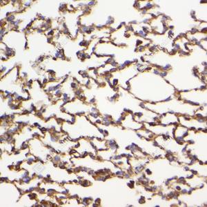 | IHC检测beta Actin蛋白(货号 GB15003). 样品: 大鼠肺, 4%多聚甲醛 (货号G1101) 固定12-24小时. 抗原修复: 柠檬酸抗原修复液(干粉, pH 6.0) (G1201), 高压锅均匀喷气计时2分钟. —抗: 1: 500稀释, 4℃ 孵育过夜. 二抗: HRP标记山羊抗兔IgG (H+L) (货号GB23303), 1: 200稀释, 室温孵育1小时. |