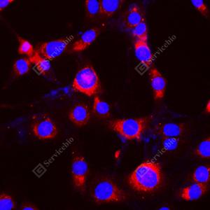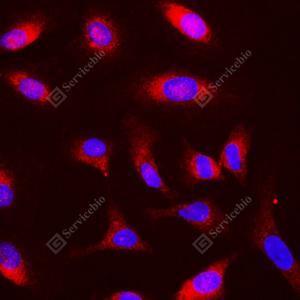| ICC检测beta Actin蛋白(货号 GB15003)(红色). 样品: NIH3T3细胞, 4%多聚甲醛 (货号G1101) 固定20分钟. 封闭: 3% BSA(货号GC305010)的PBS溶液, 室温孵育30分钟. 一抗: 1: 300稀释, 4℃ 孵育过夜. 二抗: Cy3标记山羊抗兔IgG (H+L) (货号GB21303), 1: 300稀释, 室温孵育1小时. |