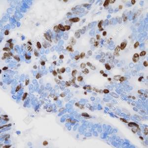 IHC检测Ki67蛋白(货号 GB151142). 样品: 小鼠结肠, 4%多聚甲醛 (货号G1101) 固定12-24小时. 抗原修复: 柠檬酸抗原修复液(干粉, pH 6.0) (G1201), 高压锅均匀喷气计时2分钟. —抗: 1: 1000稀释, 4℃ 孵育过夜. 二抗: HRP标记山羊抗小鼠IgG (H+L) (货号GB23301), 1: 200稀释, 室温孵育1小时. |