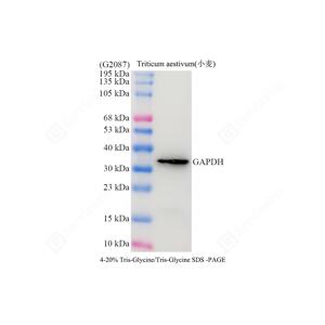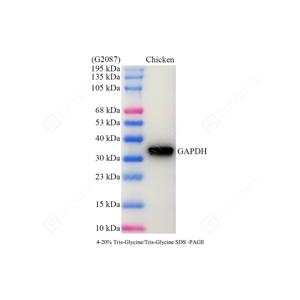 | WB检测GAPDH蛋白(货号 GB15002). 样品: 经RIPA裂解液(货号G2002)处理的蛋白质. 封闭: 3%脱脂牛奶(货号GC310001)溶于TBST溶液, 室温孵育1小时. —抗: 1: 3000稀释, 4℃ 孵育过夜. 二抗: HRP标记山羊抗小鼠IgG (H+L) (货号GB23301), 1: 5000稀释, 室温孵育1小时. |