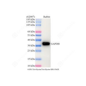 | WB检测GAPDH蛋白(货号 GB15002). 样品: 经RIPA裂解液(货号G2002)处理的蛋白质. 封闭: 3%脱脂牛奶(货号GC310001)溶于TBST溶液, 室温孵育1小时. —抗: 1: 5000稀释, 4℃ 孵育过夜. 二抗: HRP标记山羊抗小鼠IgG (H+L) (货号GB23301), 1: 5000稀释, 室温孵育1小时. |