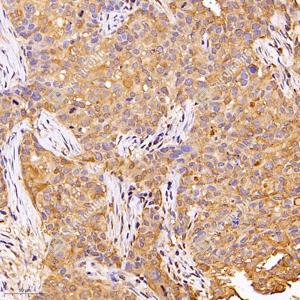 | IHC检测GAPDH蛋白(货号 GB15002). 样品: 人乳腺癌, 4%多聚甲醛 (货号G1101) 固定12-24小时. 抗原修复: 柠檬酸抗原修复液(干粉, pH 6.0) (G1201), 高压锅均匀喷气计时2分钟. —抗: 1: 1000稀释, 4℃ 孵育过夜. 二抗: HRP标记山羊抗小鼠IgG (H+L) (货号GB23301), 1: 200稀释, 室温孵育1小时. |