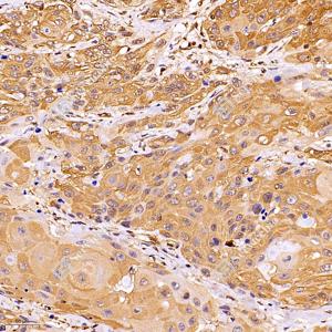 | IHC检测GAPDH蛋白(货号 GB15002). 样品: 人食管癌, 4%多聚甲醛 (货号G1101) 固定12-24小时. 抗原修复: 柠檬酸抗原修复液(干粉, pH 6.0) (G1201), 高压锅均匀喷气计时2分钟. —抗: 1: 1000稀释, 4℃ 孵育过夜. 二抗: HRP标记山羊抗小鼠IgG (H+L) (货号GB23301), 1: 200稀释, 室温孵育1小时. |