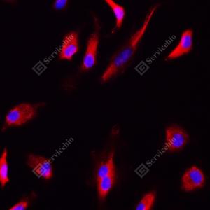 | ICC检测GAPDH蛋白(货号 GB15002)(红色). 样品: HeLa细胞, 4%多聚甲醛 (货号G1101) 固定20分钟. 封闭: 3% BSA(货号GC305010)的PBS溶液, 室温孵育30分钟. 一抗: 1: 1000稀释, 4℃ 孵育过夜. 二抗: Cy3标记山羊抗小鼠IgG (H+L) (货号GB21301), 1: 300稀释, 室温孵育1小时. |