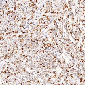 | IHC检测Ki67蛋白(货号 GB111499). 样品: 人食管癌, 4%多聚甲醛 (货号G1101) 固定12-24小时. 抗原修复: 柠檬酸抗原修复液(干粉, pH 6.0) (G1201), 高压锅均匀喷气计时2分钟. —抗: 1: 500稀释, 4℃ 孵育过夜. 二抗: HRP标记山羊抗兔IgG (H+L) (货号GB23303), 1: 200稀释, 室温孵育1小时. |