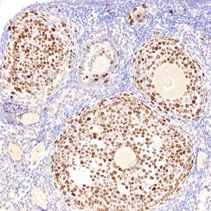 | IHC检测Ki67蛋白(货号 GB111499). 样品: 小鼠卵巢, 4%多聚甲醛 (货号G1101) 固定12-24小时. 抗原修复: 柠檬酸抗原修复液(干粉, pH 6.0) (G1201), 高压锅均匀喷气计时2分钟. —抗: 1: 500稀释, 4℃ 孵育过夜. 二抗: HRP标记山羊抗兔IgG (H+L) (货号GB23303), 1: 200稀释, 室温孵育1小时. |