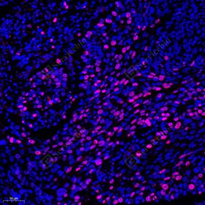 | IF检测Ki67蛋白(货号 GB111499)(红色). 样品: 人食管, 4%多聚甲醛 (货号G1101) 固定12-24小时. 抗原修复: 柠檬酸抗原修复液(干粉, pH 6.0) (G1201), 高压锅均匀喷气计时2分钟. 封闭: 3% BSA(货号GC305010)的PBS溶液, 室温孵育30分钟. —抗: 1: 500, 4℃ 孵育过夜. 二抗: Cy3标记山羊抗兔IgG (H+L) (货号GB21303), 1: 300稀释, 室温孵育1小时. |