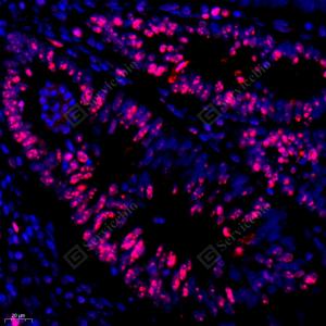 | IF检测Ki67蛋白(货号 GB111499)(红色). 样品: 人肠癌, 4%多聚甲醛 (货号G1101) 固定12-24小时. 抗原修复: 柠檬酸抗原修复液(干粉, pH 6.0) (G1201), 高压锅均匀喷气计时2分钟. 封闭: 3% BSA(货号GC305010)的PBS溶液, 室温孵育30分钟. —抗: 1: 800, 4℃ 孵育过夜. 二抗: Cy3标记山羊抗兔IgG (H+L) (货号GB21303), 1: 300稀释, 室温孵育1小时. |