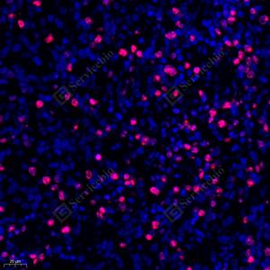 | IF检测Ki67蛋白(货号 GB111499)(红色). 样品: 大鼠脾, 4%多聚甲醛 (货号G1101) 固定12-24小时. 抗原修复: 柠檬酸抗原修复液(干粉, pH 6.0) (G1201), 高压锅均匀喷气计时2分钟. 封闭: 3% BSA(货号GC305010)的PBS溶液, 室温孵育30分钟. —抗: 1: 800, 4℃ 孵育过夜. 二抗: Cy3标记山羊抗兔IgG (H+L) (货号GB21303), 1: 300稀释, 室温孵育1小时. |