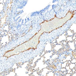 IHC检测CD31蛋白(货号 GB120005). 样品: 小鼠肺, 4%多聚甲醛 (货号G1101) 固定12-24小时. 抗原修复: 柠檬酸抗原修复液(干粉, pH 6.0) (G1201), 高压锅均匀喷气计时2分钟. —抗: 1: 1000稀释, 4℃ 孵育过夜. 二抗: S-vision免疫组化多聚二抗(山羊抗小鼠), 即用型(货号G1301), 室温孵育20分钟. |
