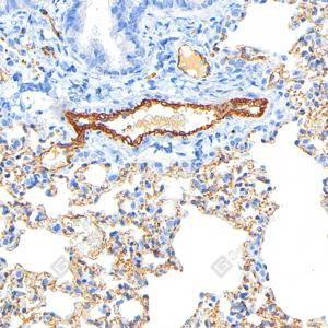 IHC检测CD31蛋白(货号 GB120005). 样品: 大鼠肺, 4%多聚甲醛 (货号G1101) 固定12-24小时. 抗原修复: 柠檬酸抗原修复液(干粉, pH 6.0) (G1201), 高压锅均匀喷气计时2分钟. —抗: 1: 1000稀释, 4℃ 孵育过夜. 二抗: S-vision免疫组化多聚二抗(山羊抗小鼠), 即用型(货号G1301), 室温孵育20分钟. |