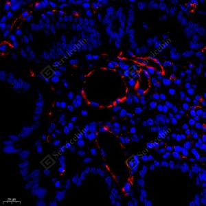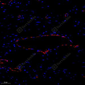 IF检测CD31蛋白(货号 GB12064)(红色). 样品: 人胃, 4%多聚甲醛 (货号G1101) 固定12-24小时. 抗原修复: 柠檬酸抗原修复液(干粉, pH 6.0) (G1201), 高压锅均匀喷气计时2分钟. 封闭: 3% BSA(货号GC305010)的PBS溶液, 室温孵育30分钟. —抗: 1: 300, 4℃ 孵育过夜. 二抗: Cy3标记山羊抗兔IgG (H+L) (货号GB21303), 1: 300稀释, 室温孵育1小时. |