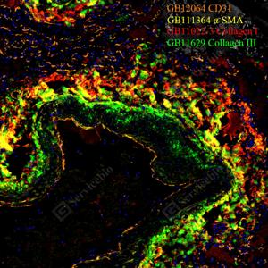 IF analysis of Collagen III(GB111629) green. sample: Human lung, 4% PFA (G1101) 12-24h. Antigen retrieval: Tris-EDTA buffer (pH 9.0) (G1203), 98℃, 20min. Blocking buffer: 3% BSA in PBS (GC305010), RT, 30min. Primary antibody: Collagen III(GB111629) green 1: 5000, 4℃ overnight.488-TSA(G1231) alpha smooth muscle Actin(GB11364) yellow 1: 3000, 4℃ overnight.iF647(G1232). CD31(GB12064) (orange)1: 2000, 4℃ overnight.iF647(G1232). Collagen I (GB11022-3) red 1: 5000, 4℃ overnight.iF555-TSA(G1233). |