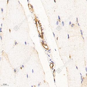 IHC检测CD31蛋白(货号 GB12063). 样品: 大鼠骨骼肌, 4%多聚甲醛 (货号G1101) 固定12-24小时. 抗原修复: 柠檬酸抗原修复液(干粉, pH 6.0) (G1201), 高压锅均匀喷气计时2分钟. —抗: 1: 200稀释, 4℃ 孵育过夜. 二抗: HRP标记山羊抗小鼠IgG (H+L) (货号GB23301), 1: 200稀释, 室温孵育1小时. |