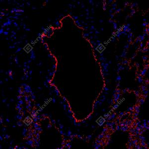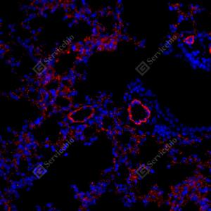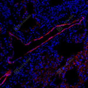IF检测CD31蛋白(货号 GB12063)(红色). 样品: 小鼠肺, 4%多聚甲醛 (货号G1101) 固定12-24小时. 抗原修复: 柠檬酸抗原修复液(干粉, pH 6.0) (G1201), 高压锅均匀喷气计时2分钟. 封闭: 3% BSA(货号GC305010)的PBS溶液, 室温孵育30分钟. —抗: 1: 600稀释, 4℃ 孵育过夜. 二抗: Cy3标记山羊抗小鼠IgG (H+L) (货号GB21301), 1: 300稀释, 室温孵育1小时. |