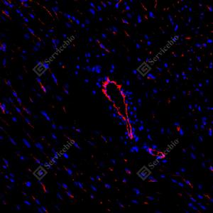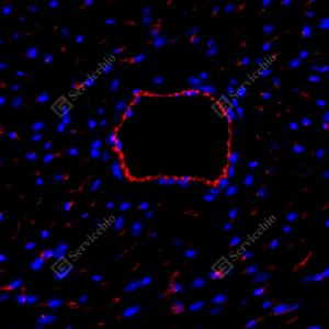 IF检测CD31蛋白(货号 GB12063)(红色). 样品: 小鼠心, 4%多聚甲醛 (货号G1101) 固定12-24小时. 抗原修复: 柠檬酸抗原修复液(干粉, pH 6.0) (G1201), 高压锅均匀喷气计时2分钟. 封闭: 3% BSA(货号GC305010)的PBS溶液, 室温孵育30分钟. —抗: 1: 600稀释, 4℃ 孵育过夜. 二抗: Cy3标记山羊抗小鼠IgG (H+L) (货号GB21301), 1: 300稀释, 室温孵育1小时. |