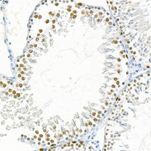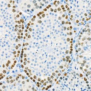 IHC检测Ki67蛋白(货号 GB121141). 样品: 小鼠睾丸, 4%多聚甲醛 (货号G1101) 固定12-24小时. 抗原修复: 柠檬酸抗原修复液(干粉, pH 6.0) (G1201), 高压锅均匀喷气计时2分钟. —抗: 1: 300稀释, 4℃ 孵育过夜. 二抗: HRP标记山羊抗小鼠IgG (H+L) (货号GB23301), 1: 200稀释, 室温孵育1小时. |