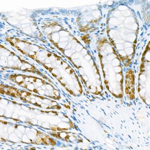 IHC检测Ki67蛋白(货号 GB121141). 样品: 大鼠结肠, 4%多聚甲醛 (货号G1101) 固定12-24小时. 抗原修复: 柠檬酸抗原修复液(干粉, pH 6.0) (G1201), 高压锅均匀喷气计时2分钟. —抗: 1: 300稀释, 4℃ 孵育过夜. 二抗: HRP标记山羊抗小鼠IgG (H+L) (货号GB23301), 1: 200稀释, 室温孵育1小时. |