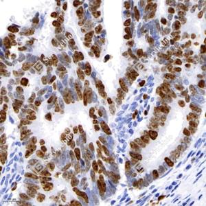 IHC检测Ki67蛋白(货号 GB121141). 样品: 人结直肠癌, 4%多聚甲醛 (货号G1101) 固定12-24小时. 抗原修复: 柠檬酸抗原修复液(干粉, pH 6.0) (G1201), 高压锅均匀喷气计时2分钟. —抗: 1: 500稀释, 4℃ 孵育过夜. 二抗: HRP标记山羊抗小鼠IgG (H+L) (货号GB23301), 1: 200稀释, 室温孵育1小时. |