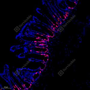 IF检测Ki67蛋白(货号 GB121141)(红色). 样品: 大鼠小肠, 4%多聚甲醛 (货号G1101) 固定12-24小时. 抗原修复: 柠檬酸抗原修复液(干粉, pH 6.0) (G1201), 高压锅均匀喷气计时2分钟. 封闭: 3% BSA(货号GC305010)的PBS溶液, 室温孵育30分钟. —抗: 1: 500稀释, 4℃ 孵育过夜. 二抗: Cy3标记山羊抗小鼠IgG (H+L) (货号GB21301), 1: 300稀释, 室温孵育1小时. |