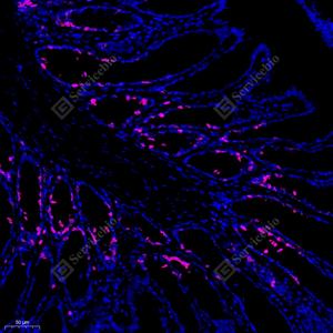 IF检测Ki67蛋白(货号 GB121141)(红色). 样品: 小鼠小肠, 4%多聚甲醛 (货号G1101) 固定12-24小时. 抗原修复: 柠檬酸抗原修复液(干粉, pH 6.0) (G1201), 高压锅均匀喷气计时2分钟. 封闭: 3% BSA(货号GC305010)的PBS溶液, 室温孵育30分钟. —抗: 1: 500稀释, 4℃ 孵育过夜. 二抗: Cy3标记山羊抗小鼠IgG (H+L) (货号GB21301), 1: 300稀释, 室温孵育1小时. |
