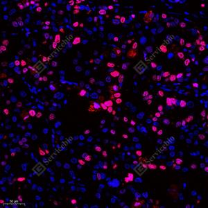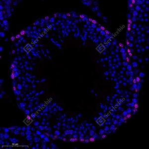 IF检测Ki67蛋白(货号 GB121141)(红色). 样品: 大鼠睾丸, 4%多聚甲醛 (货号G1101) 固定12-24小时. 抗原修复: 柠檬酸抗原修复液(干粉, pH 6.0) (G1201), 高压锅均匀喷气计时2分钟. 封闭: 3% BSA(货号GC305010)的PBS溶液, 室温孵育30分钟. —抗: 1: 500稀释, 4℃ 孵育过夜. 二抗: Cy3标记山羊抗小鼠IgG (H+L) (货号GB21301), 1: 300稀释, 室温孵育1小时. |