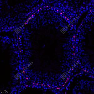 IF检测Ki67蛋白(货号 GB121141)(红色). 样品: 小鼠睾丸, 4%多聚甲醛 (货号G1101) 固定12-24小时. 抗原修复: 柠檬酸抗原修复液(干粉, pH 6.0) (G1201), 高压锅均匀喷气计时2分钟. 封闭: 3% BSA(货号GC305010)的PBS溶液, 室温孵育30分钟. —抗: 1: 500稀释, 4℃ 孵育过夜. 二抗: Cy3标记山羊抗小鼠IgG (H+L) (货号GB21301), 1: 300稀释, 室温孵育1小时. |